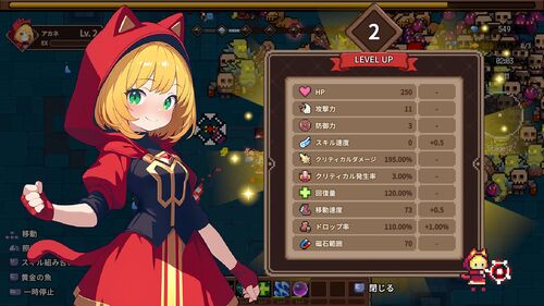アカネちゃんでステージ2へ! 立ち絵かわゆいのう レベル1でいきなりステージ2に来たからか 圧倒的に火力が足りない・・・ 攻撃10発くらいあててようやく1匹敵を倒せるレベル すぐ囲まれて逃げ場がないし負ける未来が見えるなぁ なんだかスキル揃ってきても…